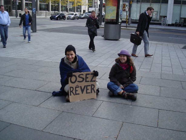 En repartant, j’ai croisé deux jeunes assis devant la sortie du métro. Pas des pauvres, pas des désemparés. Deux jeunes qui rigolaient. Face aux bonnefemmes pressées et aux bonshommes en costard au regard beige, ils rigolaient, munis d’une pancarte : « osez rêver ».