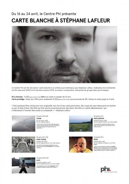 <a href="https://voir.ca/danny-lennon/files/2013/04/1.jpg"><img src="https://voir.ca/danny-lennon/files/2013/04/1-428x612.jpg" alt="" width="428" height="612" class="aligncenter size-medium wp-image-2506" /></a> Dès ce soir, Stéphane Lafleur vous présente son premier choix: CHAIN de Jem Cohen au Centre PHI à Montréal. www.phi-centre.com