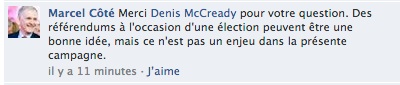 Le 19 août dernier, j’ai interpellé Marcel Côté sur Facebook alors qu’il annonçait des candidatures : « M Côté, est-ce que vous avez l’intention de mettre en application la suggestion de M. Rotrand et organiser des référendums lors des élections municipales? »