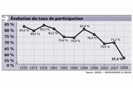 De fait, entre 1976 et 2008, le taux de participation aux élections générales québécoises a chuté de 28%, passant de 85% à 57%!