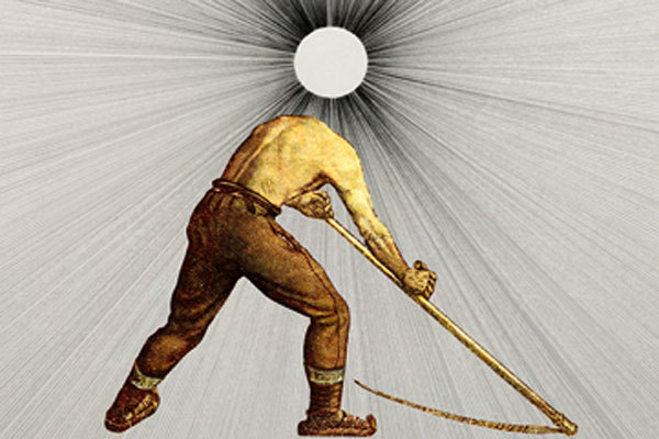 La figure de l’Acéphale, l’homme sans tête qui travaille à couper les rayons du soleil, fait apparaître notre volonté comme un potentiel destructeur. L’accumulation de pièces de 0.01¢ coupées est le fruit d’une performance où, cagoulé comme un bourreau, il a fait un sacrifice des monnaies, une transformation de la matière en symbole.