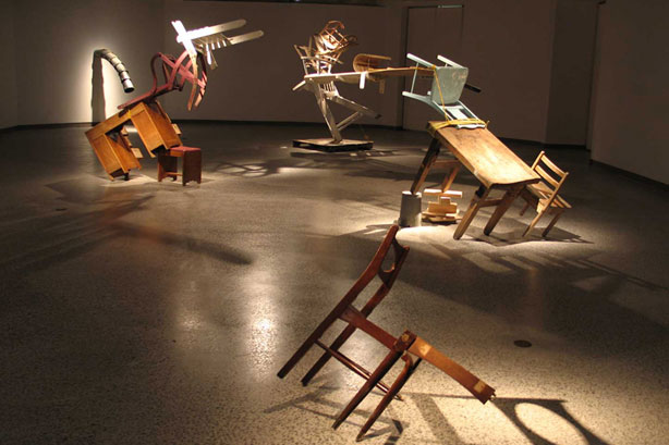 Jusqu’au 22 novembre, l’exposition Mise en scène invite le public de Jonquière à une visite dans un univers insolite et poétique. L’artiste explique que cette exposition, inspirée du théâtre d’objet, repose sur l’usage d’objet du quotidien dont le contexte a été modifié. Ces objets, assemblés par d’étranges affinités, proposent de nouvelles formes et de nouvelles significations. Liés entre eux par des cordes, entassés ou adossés, des éléments de mobiliers sont intégrés à des sculptures dynamiques, à un jeu d’équilibre savamment atteint à l’aide de tension et de points d’appui.