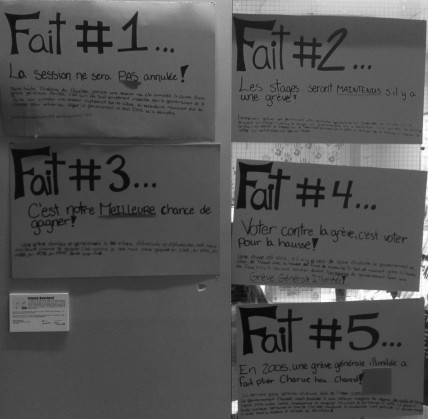 Aujourd’hui, nous n’étions pas tant préparés, puisque nous n’avions pas eu assez de temps et de mains entre hier soir et ce matin (plusieurs des étudiants ont travaillé le soir même ou étaient trop fatigués), mais nous avons préparé la journée de demain et avons avisé l’ensemble des étudiants du CEGEP, pour leur permettre de participer. De plus, nous avons manifesté dans les rues de Montréal entre 15h00 et 16h30 et avons même eu certains étudiants qui sont allés manifester au CEGEP de Rosemont. D’ailleurs, il y avait des étudiants en pause pendant des moments différents entre 10h00 et 12h30.