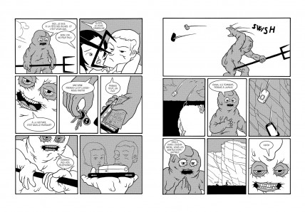 On tourne les pages. Au fil de la lecture, la curiosité domine le sentiment de malaise ambiant qui en ressort. Le dessin est de facture simple : noirs, blanc, gris. L’intrigue surréaliste est rythmée. Efficace. Il n’y a pas d’accalmie. Pas réellement : on devine de courte durée le répit de ces héros pas si sympathiques qui sont au cœur de Trame, on devine inéluctable leur descente vers le pire. En se demandant, justement, quel sera ce pire…