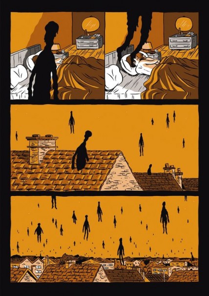 Puis, tranquillement, la chute. Celle de l’homme du couple, qu’on suit, au fil des pages de cette petite bande dessinée en blanc, noir et orange. Un dessin efficace. Une descente vers le malheur, vers le spleen, le mal de vivre, voire la dépression…