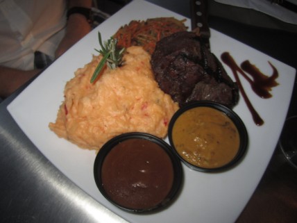 Le filet mignon, commandé saignant, estt également cuit à la perfection. La portion est respectable. La purée pomme de terre et carotte fut servie tiède mais de bon goût.Il faut tout de même apprécier le goût de la carotte dans la purée…. La sauce érable et estragon est onctueuse, pas trop sucrée. La sauce au bleu, commandée en plus, était malheureusement trop salée.
