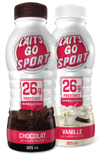 Une toute nouvelle boisson protéinée vient d’apparaître sur nos tablettes, il s’agit du lait protéiné Lait’s Go Sport. Lancé tout récemment par Saputo, cette boisson sportive se veut un produit à haute teneur en protéines, offrant les bienfaits naturels du lait, et destiné aux gens actifs qui désirent maintenir un mode de vie sain et équilibré. Ici, on dit adieu aux ingrédients indésirables et aux mélanges de poudres pas très rassurants. Fabriqué à Ottawa, il est disponible en version chocolat ou vanille et constitue une excellente source de cinq nutriments essentiels et vitamines. En plus, il est très bon au goût et il est disponible à peu près partout à un prix variant entre 1,99$ et 2,49$ pour une bouteille de 325 ml. Et, devinez quoi, il pourrait même avoir une incidence positive sur la perte de poids… Mmmmm, allons voir ce qu’en a pensé Suzanne, la nutritionniste officielle de Curiosités & Gourmandises.
