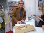 Jean-François Beauchemin, un de mes auteurs favoris. En fait, il serait plus juste de dire parmi les êtres humains que je privilégie, qui s’adonne à être un auteur que je lis assidûment. Il est si près de ses écrits, aimer ses textes, c’est l’aimer, pas plus compliqué que ça. Il était sur le point de quitter après une séance de dédicaces. Nous avons bavardé et quand je dis « nous », j’étais heureuse que Marsi y soit. Monsieur Beauchemin s’est d’ailleurs procuré Miam miam fléau au kiosque La Pastèque tout à côté, et Marsi, l’auteur, lui a dessiné un gigantesque Borbo. Précieuse rencontre. J’ai en possession Le hasard et la volonté, son petit-dernier que j’ai très hâte de lire.