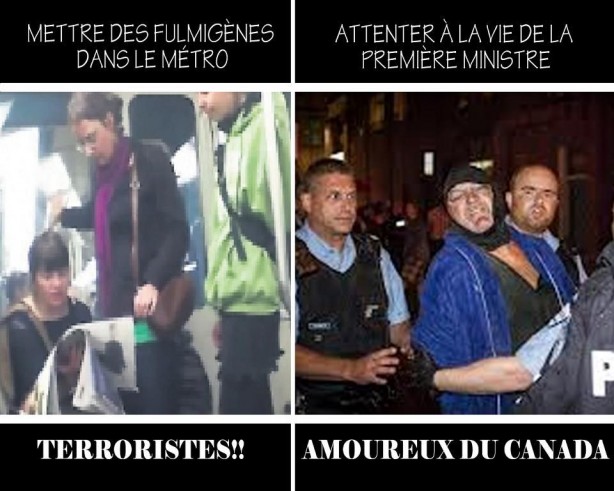 Oui, la précision semble importante. les quatre accusés dans l’affaire des engins fumigène ne sont pas (sauf erreur de ma part) accusés de terrorisme mais bien “d’incitation à craindre des activités terroristes”. Il s’agit d’une “modification du Code criminel” adoptée en 2004 dans le cadre de la Loi sur la Sécurité Publique. Elle vise en fait ceci: le canular (cf. L’Initiative Sécurité publique et antiterrorisme (SPAT), Évaluation sommative, §5.2). Il n’est donc pas nécessaire d’avoir causé la mort ou la destruction en vertu d’une idéologie (religieuse ou politique) ni d’être formellement identifié comme terroriste. Cette modification du code criminelle semble beaucoup plus englobante, flexible et permet de porter des accusations sur la base d’un jugement très général: des gestes sont commis, y a-t-il lieu ou non, suivant ces gestes et peu importe leur conséquence réelle, de craindre à une activité terroriste quelconque. Mme Robert saura corriger mon interprétation. Mais il me semble d’emblée que l’image au tout début de ce billet est basée sur une compréhension erronée des accusations portées contre les étudiants.